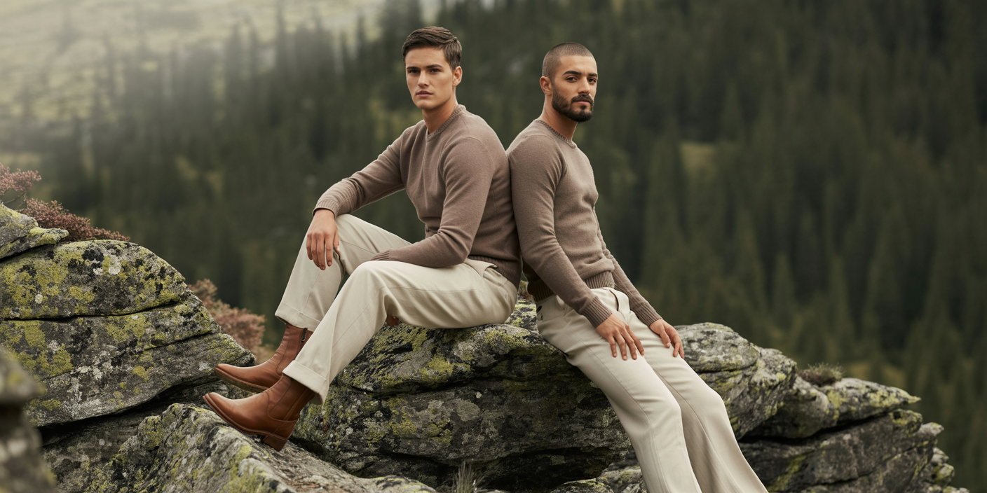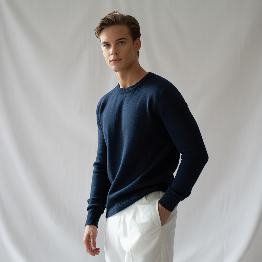 Chaque pièce qu’il porte, du pull bleu marine au pantalon blanc immaculé, témoigne d’un savoir-faire artisanal et d’une esthétique sobre, pure et maîtrisée.